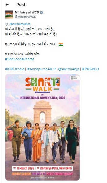 अंतरराष्ट्रीय महिला दिवस, जो 8 मार्च को वैश्विक रूप से मनाया जाता है, जीवन के सभी क्षेत्रों में महिलाओं की उपलब्धियों, नेतृत्व और योगदान का उत्सव मनाता है तथा लैंगिक समानता, सुरक्षा, गरिमा और सशक्तिकरण की सामूहिक प्रतिबद्धता को पुनः दोहराता है। इसी भावना में, शक्ति वॉक का आयोजन प्रगतिशील और समावेशी भारत को आकार देने में महिलाओं की केंद्रीय भूमिका को रेखांकित करने के लिए किया जा रहा है।