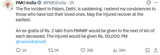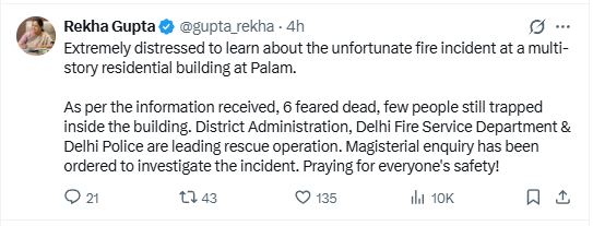 “दिल्ली के पालम में हुई आग की घटना से अत्यंत दुख हुआ है। जिन परिवारों ने अपने प्रियजनों को खोया है, उनके प्रति मेरी गहरी संवेदनाएं हैं। घायलों के जल्द स्वस्थ होने की कामना करता हूं। प्रशासन को हर संभव मदद करने के निर्देश दिए गए हैं।”