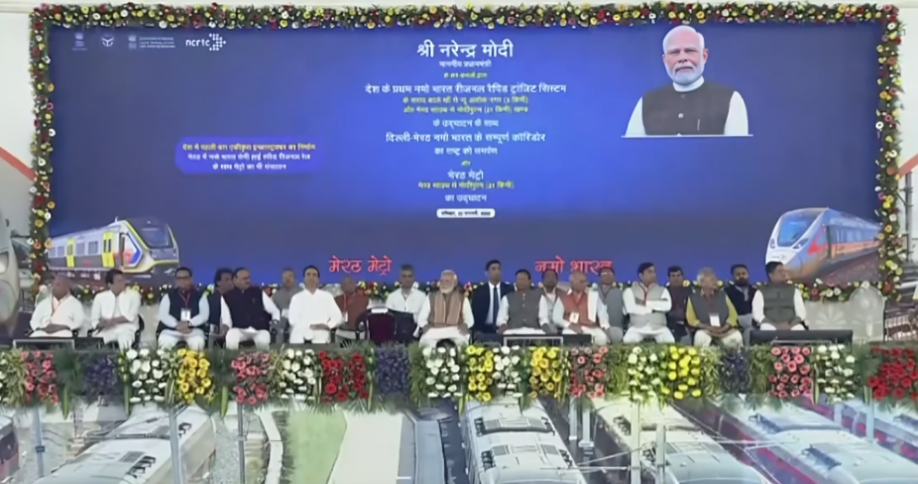 दिल्ली से मेरठ रैपिड मैट्रो (नमो भारत RRTS) की प्रधानमंत्री नरेंद्र मोदी ने मेरठ में हरी झंडी दिखाकर पूर्ण रुप से उद्घाटन किया है,जिससे म पूरा होगा जबकि पहले 2-3 घंटे लगते थे। 82 किलोमीटर लंबे दिल्ली-मेरठ नमो भारत कॉरिडोर (सराय काले खां से मोदीपुरम तक) को पूरी तरह चालू कर दिया गया है। इसमे दिल्ली से मेरठ तक कुल 16 स्टेशन होंगे।इस मौके पर उत्तर प्रदेश के मुख्यमंत्री योगी आदित्यनाथ भी मौजूद रहे और उन्होंने इस परियोजना को ‘नए भारत’ की तेज विकास गति का प्रतीक बताया।