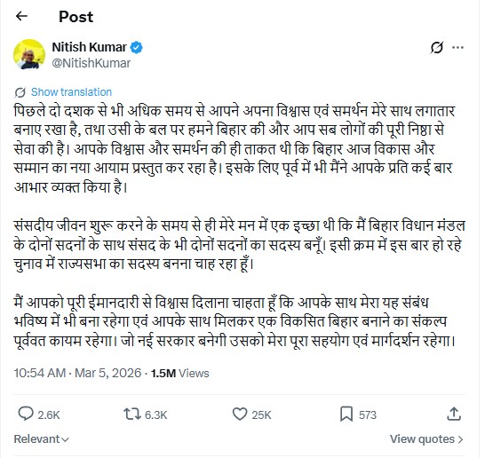 नीतीश कुमार ने सोशल मीडिया पर लिखा है कि “संसदीय जीवन शुरू करने के समय से ही मेरे मन में एक इच्छा थी कि मैं बिहार विधान मंडल के दोनों सदनों के साथ संसद के भी दोनों सदनों का सदस्य बनूं।” उन्होंने कहा कि पिछले दो दशकों से ज्यादा समय से यह ख्वाहिश मन में थी, और अब राज्यसभा चुनाव में भाग लेकर इसे पूरा करना चाहते हैं। उन्होंने बिहार की जनता को धन्यवाद दिया और कहा कि नई सरकार को उनका पूरा सहयोग रहेगा।