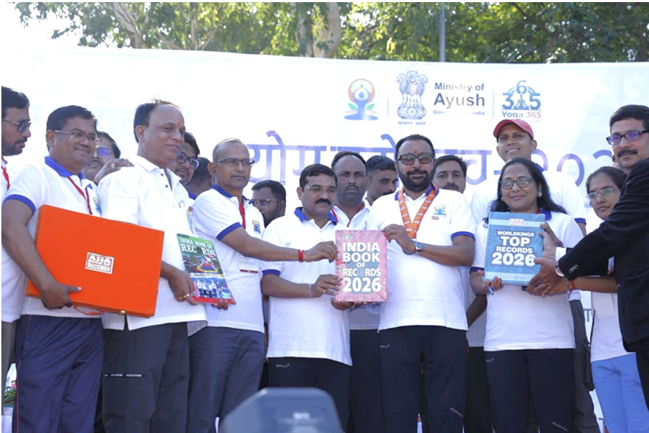 महाराष्ट्र: लोनार में योग महोत्सव-2026 के दौरान 5,000 लोगों ने सामूहिक त्रिकोणासन कर एशिया बुक ऑफ रिकॉर्ड्स में नाम दर्ज कराया। आयुष मंत्रालय के मोरारजी देसाई राष्ट्रीय योग संस्थान (एमडीएनआईवाई) द्वारा महाराष्ट्र के बुलढाणा जिले के ऐतिहासिक शहर लोनार में आयोजित योग महोत्सव-2026 ने एक नया इतिहास रच दिया। इस आयोजन में लगभग 5,000 प्रतिभागियों ने एक साथ त्रिकोणासन कर एशिया बुक ऑफ रिकॉर्ड्स में अपना नाम दर्ज कराया।
